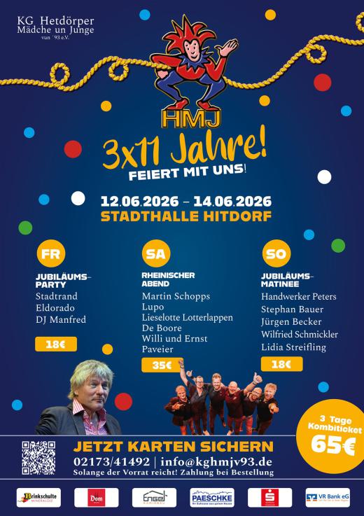 33 Jahre voller Freude, Gemeinschaft und karnevalistischer Tradition – das ist ein Grund zum Feiern! Wir laden Sie herzlich ein, mit uns ein unvergessliches Wochenende zu verbringen, mit Musik, guter Stimmung und einem Rückblick auf über drei Jahrzehnte HMJ. Kommen Sie vorbei und feiern Sie gemeinsam mit uns dieses besondere Jubiläum!